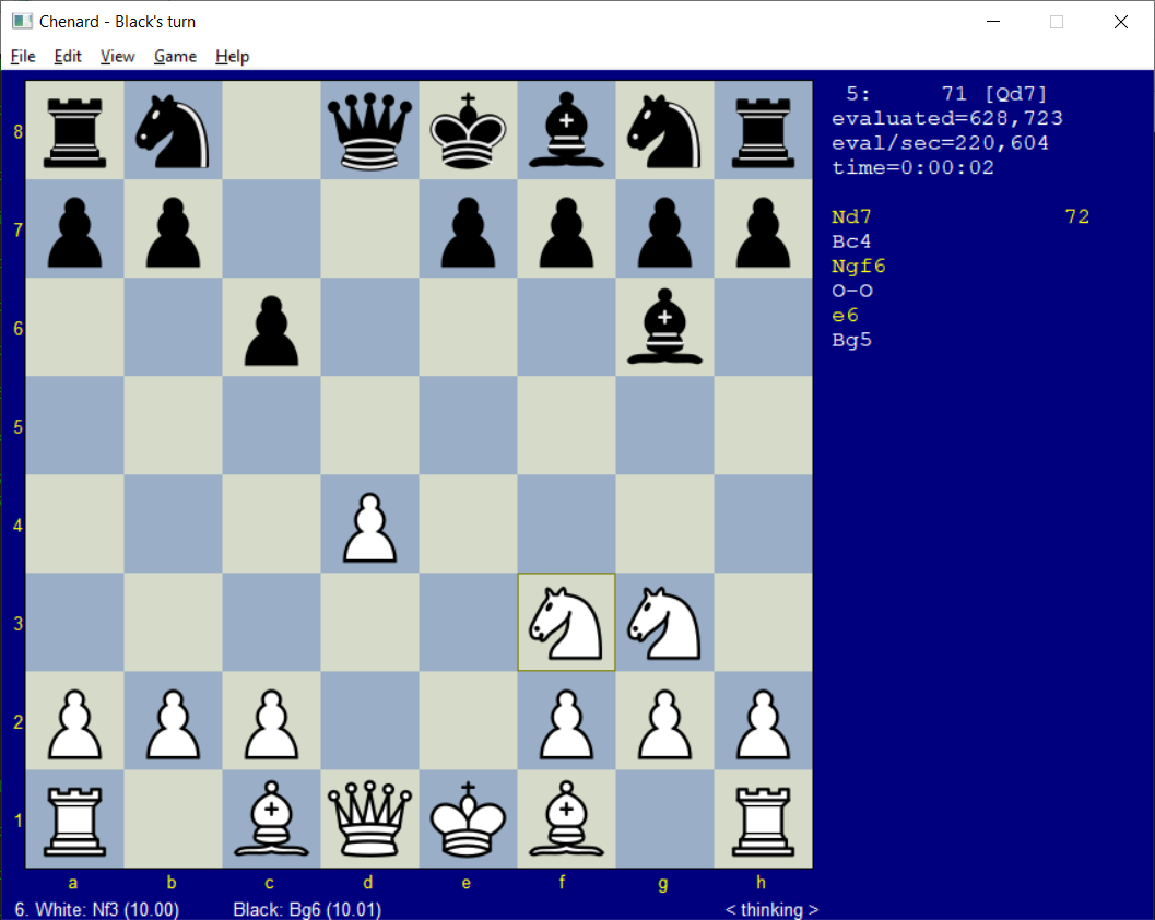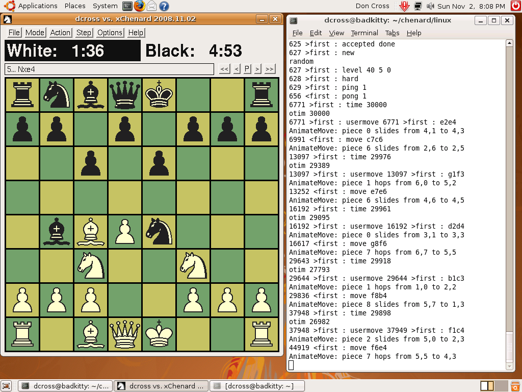 Linux users can also compile a primitive, text-only version of Chenard using the same source code from the Chenard repo on GitHub. I would recommend trying the xboard version above first. However, some researchers and experimenters may prefer this version for hacking, since the code may be easier to port as a standalone application. Maybe you are building your own Linux-based chess robot, and you just need a chess engine whose source code is (relatively) easy to tweak? This version might be just the thing.