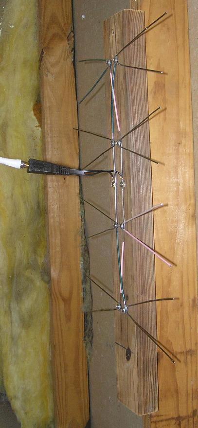 First, I added two extra screws at the very center of the antenna for attaching the balun, as specified in the TV Antenna Plans site. Although I could not measure any difference in signal strength, I do have to admit that this antenna would have been easier to assemble if I had made it this way in the first place. My original approach made it awkward to hold two pieces of coat hanger wire, a washer, and the balun terminal in place while torquing down these two screws. For that reason alone, I recommend using the extra two screws and washers if you are building one of these antennas for yourself. Here is what the antenna looks like now: