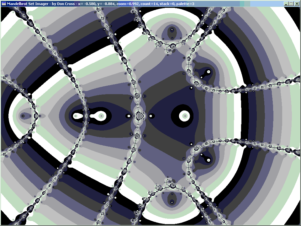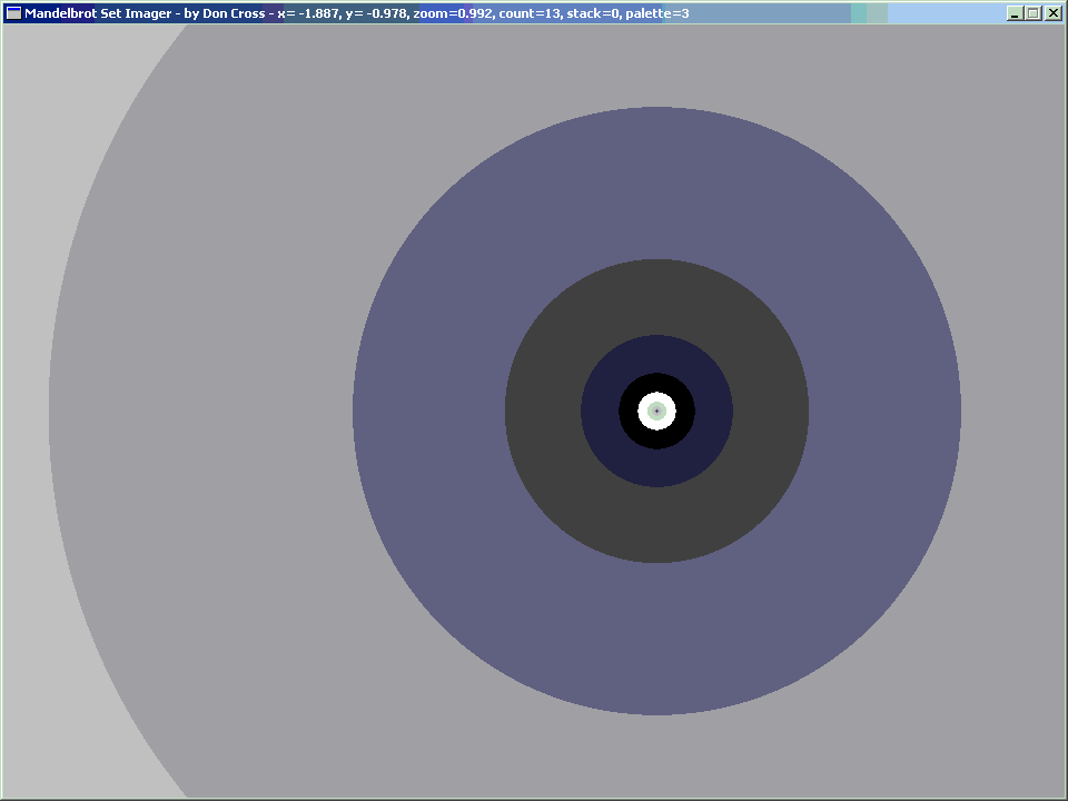 It occurred to me that it would be interesting to graph solutions for various orbital periods in the Mandelbrot formula. For example, if I wanted to find places where the Mandelbrot formula repeated every iteration (i.e. orbital period = 1), I would solve for z2 + z = z, or z2 = 0. Of course, this is a trivial case, since it is obvious that the only solution is z=0.