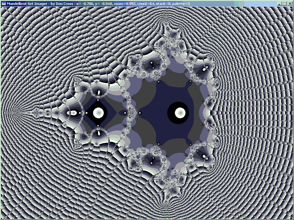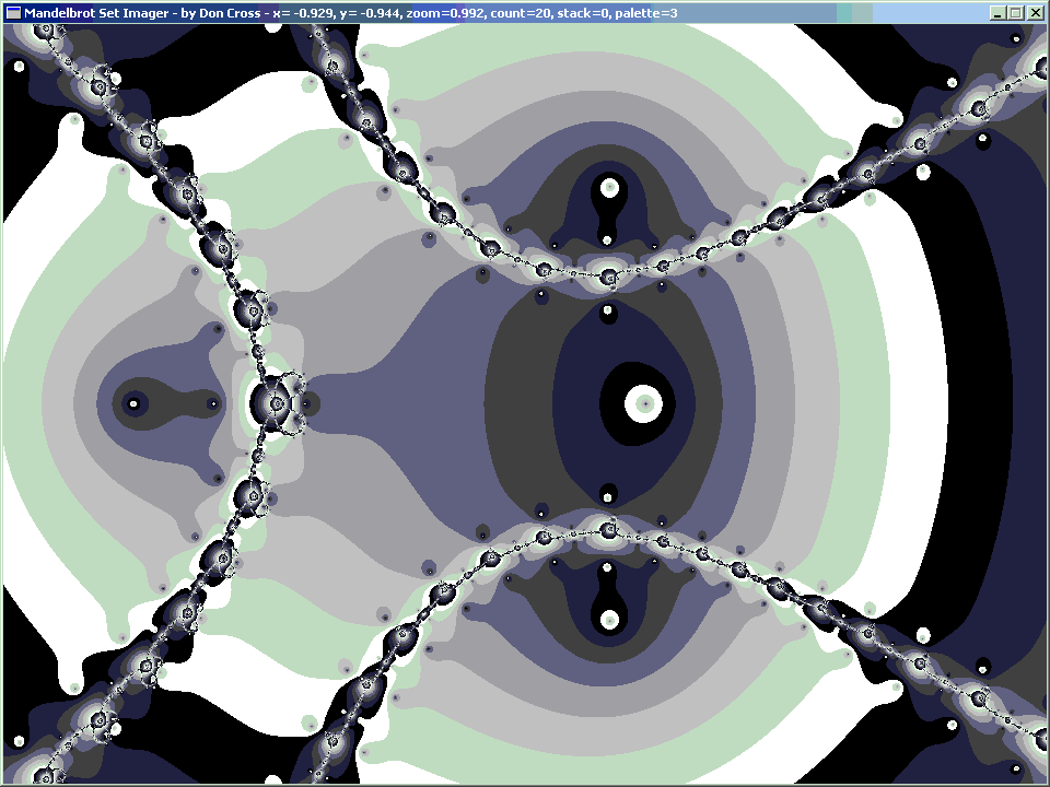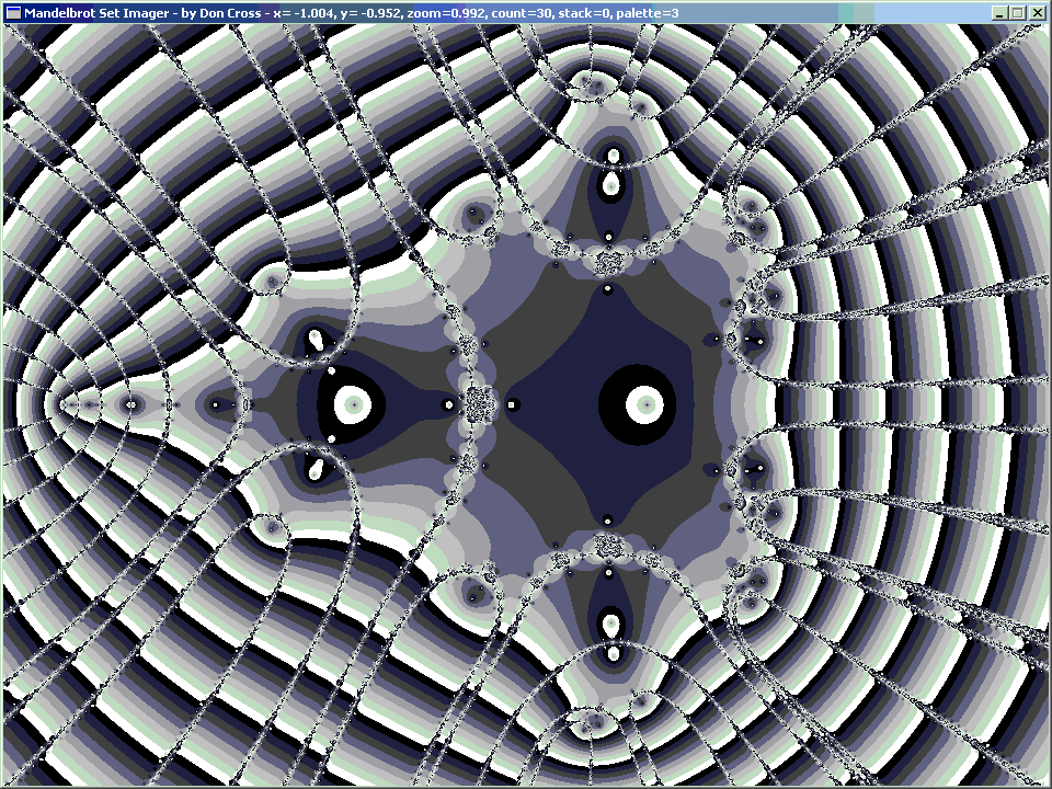 For the orbital period of 2, we get our first non-trivial image. This time it is a fractal. The solutions are z = +1 and z = −1, which show up as the larger horizontal eyes. This is interesting, but there is no resemblance of the Mandelbrot Set (yet).