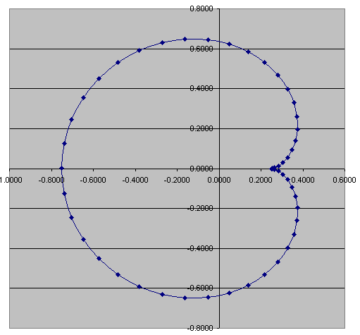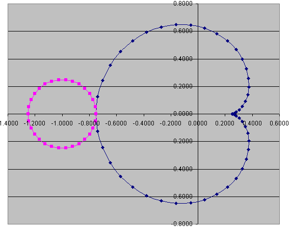 This formula describes a perfect circle, centered at −1 with a radius of ¼. The Main Disk thus has an area of π/16 = 0.196349540849.... It is interesting to note that the Main Disk's area is exactly 1/6 the area of the Main Cardioid. Adding the two regions together yields an area of 7π/16 = 1.3744467859455..., which is about 91% of the total area of the Mandelbrot Set. See also [Areas of Mandelbrot fractals].Using Microsoft Excel again, I plotted this formula and superimposed its graph on the cardioid graph to obtain: