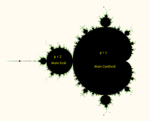 Figure 1: The Mandelbrot Set with p=1 and p=2 regions labeled |