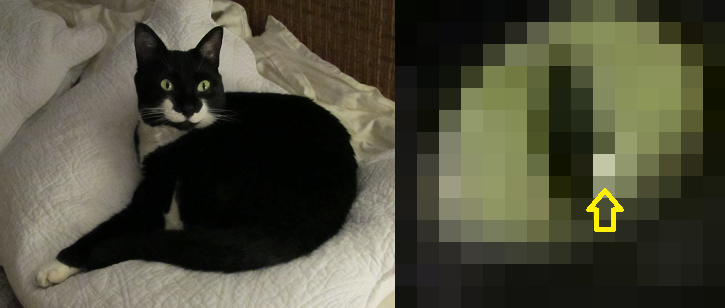 The amount of detail in a digital image, called resolution, increases with the number of pixels the image contains. Typical digital images have hundreds or even thousands of pixels on a side. For example, the cat image on the left side of Figure 2.1 is 395 pixels wide and 308 pixels high. Some images may have a much smaller pixel count if they are used for desktop icons, mouse pointers, or image thumbnails. Beyond a few thousand pixels on a side, images become unwieldy in terms of memory usage and bandwidth, so width and height dimensions of between 200 to 2000 pixels are the most common compromise of resolution and efficiency.