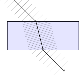 The same figure shows how refraction in the opposite direction occurs when the wave emerges from the other side of the substance: the parts of a wave that exit the substance first speed up before other parts, causing the wave to bend away from the surface's perpendicular line.