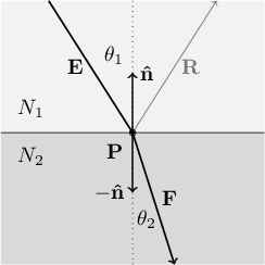 If our task were simply the calculation of the angle $\theta_2$, things would be quite simple. Unfortunately, we are dealing with vectors in three-dimensional space. We know the two refractive indices $N_1$ and $N_2$, the incident light ray vector $\mathbf{E}$, and the surface normal vector $\mathbf{\hat{n}}$ indicating the direction perpendicular to the interface between the two substances. From these known quantities, we need to calculate the direction vector $\mathbf{F}$ of the refracted light ray. To set up the solution, we first define unit vectors that point in the same direction as $\mathbf{E}$ and $\mathbf{F}$: