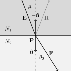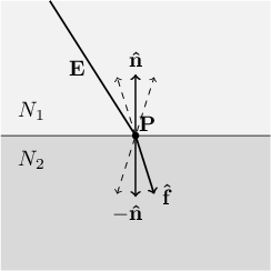 \[ \begin{cases} & N_1 \sin(\theta_1) = N_2 \sin(\theta_2) \\ & \mathbf{\hat{e}} \cdot \mathbf{\hat{n}} = \pm \cos(\theta_1) \\ & \mathbf{\hat{f}} \cdot \mathbf{\hat{n}} = \pm \cos(\theta_2) \end{cases} \]