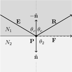 When a light ray passes from one substance into another of lower refractive index, for example from water into air, there is a limit to how steep the entry angle $\theta_1$ can be before refraction is no longer possible. When $\theta_1$ increases to a value such that $\theta_2$ reaches $90°$, refraction ceases and all of the light energy is reflected. The value of $\theta_1$ where this occurs is called the critical angle of incidence, which we will designate $\theta_c$. Figure 9.4 shows the same optical setup as 9.3, only with the incident light ray $\mathbf{E}$ at the critical angle $\theta_c$. We can use Snell's Law to calculate $\theta_c$ by replacing $\theta_1$ with $\theta_c$ and setting $\theta_2 = 90°$, which means that $\sin(\theta_2)=1$. Solving for $\theta_c$ gives us: