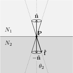 We could solve this equation for the unknown value $(\mathbf{\hat{f}}\cdot\mathbf{\hat{n}})^2$ in terms of the other quantities (which all have known values), but we would still run into a problem: there are an infinite number of unit vectors $\mathbf{\hat{f}}$ whose squared dot product with the normal vector $\mathbf{\hat{n}}$ would yield the known numeric quantity on the other side of the equation. Although $\mathbf{\hat{n}}$ is a known vector, and thus its position is fixed in space, there are an infinite number of unit vectors $\mathbf{\hat{f}}$ whose squared dot product with $\mathbf{\hat{n}}$ will be equal to the value $\cos^2(\theta_2)$. Figure 9.5 shows that the set of all such $\mathbf{\hat{f}}$ sweeps out a pair of cone shapes from the incidence point $\mathbf{P}$, one cone for each side of the surface.