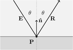 In spite of all of these differences, they share an important geometrical trait. In both kinds of mirror reflection, the same incident ray $\mathbf{E}$ results in a reflected ray traveling in exactly the same outgoing direction $\mathbf{R}$, as depicted in Figure 10.1. For this reason, the ray tracer code calculates the intensities and colors of glossy reflection and refractive reflection separately, but adds them together and calculates their common direction $\mathbf{R}$ using a single member function CalculateReflection.