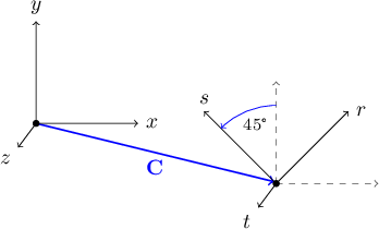 The $(r, s, t)$ axes have been rotated about the object's center, which is $(r,s,t)=(0,0,0)$ or $(x,y,z)=(C_x,C_y,C_z)$ by $45°$ counterclockwise parallel to the $z$ axis, looking into the $z$ axis, where $\mathbf{C} = (C_x, C_y, C_z)$ is the object's center as expressed in camera space.