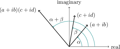 But how do complex numbers help us rotate two-dimensional vectors? I alluded to a trick, and here it is: when two complex numbers, say $a + ib$ and $c + id$ are multiplied, the product has the following relationship with the two complex numbers we started with: