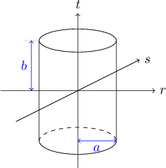 The cylinder is aligned along the $t$ axis, with its top disc located at $t = +b$ and its bottom disc at $t = -b$. The discs and the lateral tube have a common radius $a$. These three surfaces have the equations and constraints as shown in Table 11.6.