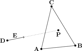 \begin{align*} & \mathbf{P} = \mathbf{A} + v(\mathbf{B}-\mathbf{A}) + w(\mathbf{C}-\mathbf{A}) \end{align*}
