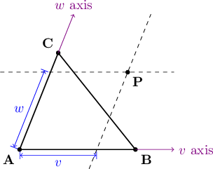 We extend a line starting at $\mathbf{A}$ and proceeding through $\mathbf{B}$. This line extends infinitely along that direction, and becomes our $v$ axis. Likewise, the $w$ axis starts at $\mathbf{A}$ and extends through $\mathbf{C}$ and off to infinity. For any point $\mathbf{P}$ on the same plane as $\mathbf{A}\mathbf{B}\mathbf{C}$, we can draw lines through $\mathbf{P}$ that are parallel to the $v$ and $w$ axes, as indicated by the dashed lines in Figure 12.3. The line passing through $\mathbf{P}$ parallel to the $v$ axis will pass through the $w$ axis somewhere, and the one parallel to the $w$ axis will pass through the $v$ axis at another location. We can think of these locations along the $v$ and $w$ axes as "shadows" of the point $\mathbf{P}$ falling onto them. I will define the value $v$ as the $v$ component of $\mathbf{P}$ ($\mathbf{P}$'s shadow on the $v$ axis) and $w$ as the $w$ component of $\mathbf{P}$ ($\mathbf{P}$'s shadow on the $w$ axis). Furthermore, $v$ can be thought of as the fraction of the distance along the line segment $\mathbf{A}\mathbf{B}$ that the shadow lies, such that $\mathbf{A}$ is at $v=0$ and $\mathbf{B}$ is at $v=1$. For example, if the shadow of $\mathbf{P}$ lies one fourth of the distance from $\mathbf{A}$ to $\mathbf{B}$, we say that $v=0.25$. Negative numbers work fine also: if the shadow of $\mathbf{P}$ on the $v$ axis is the same distance from $\mathbf{A}$ as $\mathbf{B}$ is, but is in the opposite direction as $\mathbf{B}$, we say that $v=-1$. If $\mathbf{P}$'s shadow on the $v$ axis is in the same direction as $\mathbf{B}$ from $\mathbf{A}$, but is twice as far away, we say that $v=2$. So $v$ may have any value from $-\infty$ to $+\infty$, depending on where $\mathbf{P}$ is on the infinite plane passing through the triangle $\mathbf{A}\mathbf{B}\mathbf{C}$. Analogously, $w$ is defined as the fraction along the line segment $\mathbf{A}\mathbf{C}$ that the shadow of $\mathbf{P}$ measures along the $w$ axis.