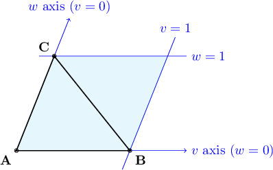 The region of the plane between the horizontal lines $w=0$ and $w=1$ is an infinitely wide horizontal strip, each point of which has a value of $w$ between 0 and 1. Likewise, the slanted strip between the slanted lines $v=0$ and $v=1$ is the set of all points where $v$ is between 0 and 1. These two regions each have an infinite area, but they overlap in a finite extent: a parallelogram as shown by the shaded region in Figure 12.4. This parallelogram encompasses all points where $0 \le v \le 1$ and $0 \le w \le 1$. But it includes twice as much area as the intended triangle $\mathbf{A}\mathbf{B}\mathbf{C}$. What we really want is a collection of three constraints: to be inside the triangle, a point must be above the line passing through $\mathbf{A}$ and $\mathbf{B}$ (i.e., above the $v$ axis), to the right of the line passing through $\mathbf{A}$ and $\mathbf{C}$ (to the right of the $w$ axis) and to the left of the line passing through $\mathbf{B}$ and $\mathbf{C}$.