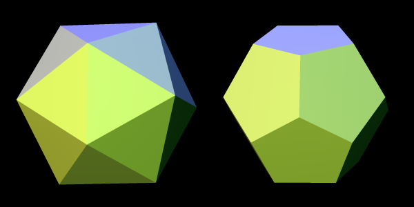 An example of using the TriangleMesh class is provided in icosahedron.cpp: the class Icosahedron derives from class TriangleMesh, and its constructor shows how to call AddPoint and AddTriangle to build a 20-sided regular polyhedron. When you run the raytrace unit test, an icosahedron (and a dodecahedron) will appear in the output file polyhedra.png, thanks to the function TestPolyhedra in main.cpp. (See Figure 12.5.)