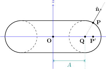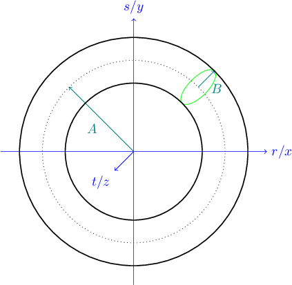 We now explore how to use the ray tracer code to draw a torus, which is more commonly known as a donut shape. This shape is implemented by class Torus, which is declared in imager.h and implemented in torus.cpp. Two constants suffice to define the shape of the torus: $A$, the distance from the center of the hole inside the torus and the center of its tube, and $B$, the radius of the tube, as shown in Figure 13.1. In order to ensure that there is a hole inside the torus, we will assume that $A > B$.