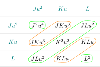 Grouping the grid in upward sloping diagonals, as shown by the five curves in the figure, reveals collections of like powers of $u$. Summing the terms along these diagonals and factoring out the common powers of $u$, we have: