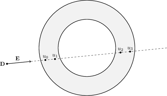 Take a look in torus.cpp at the method Torus::SolveIntersections. Given a vantage point and a direction vector, it finds all positive real solutions for $u$. Because the intersection equation is quartic in $u$, there can be up to four real solutions. This makes sense intuitively because a ray can pierce a torus in up to four places, marked $u_0$ through $u_3$ in Figure 13.3.
